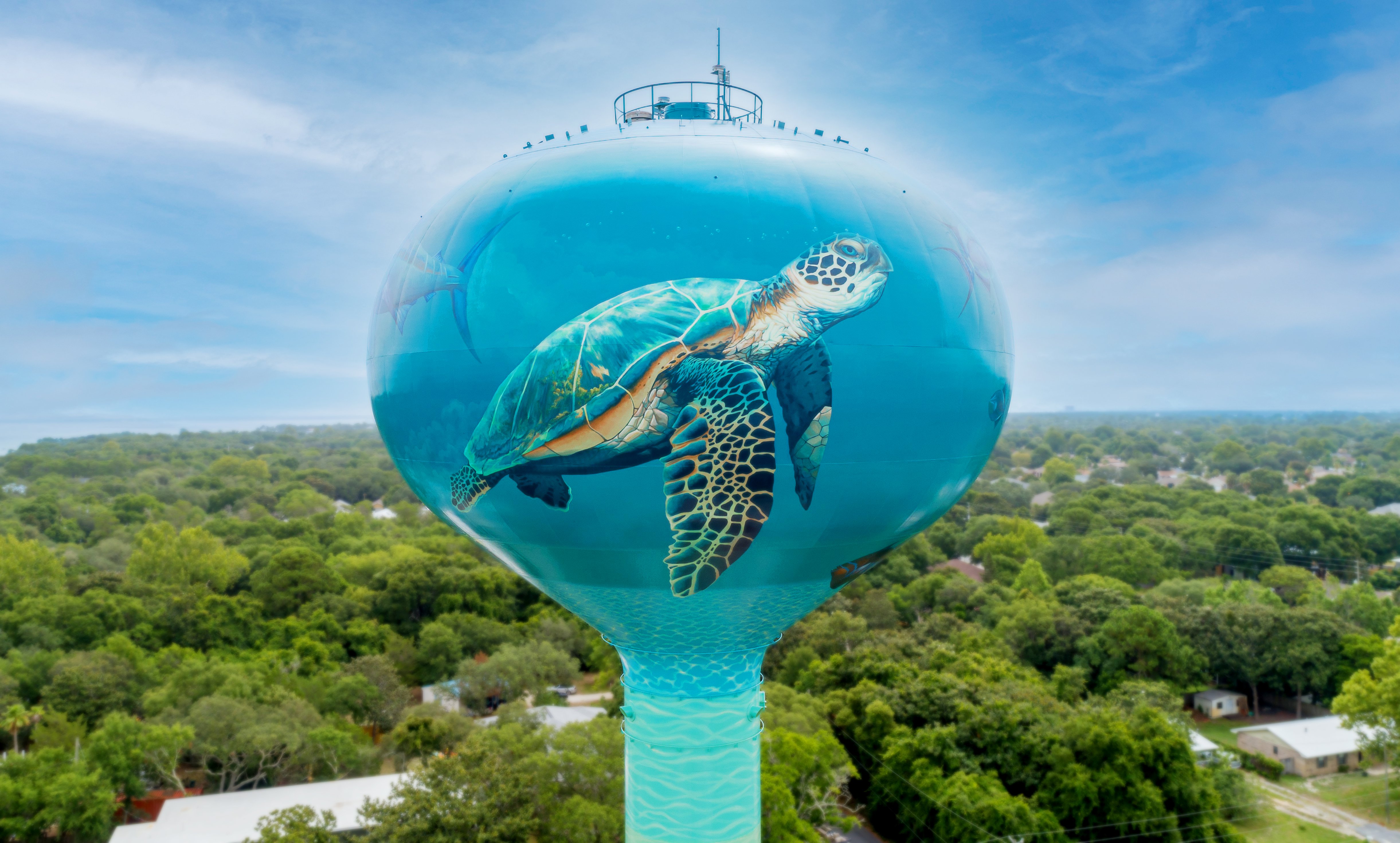 “The tank includes a one-of-a-kind seascape mural that now stands high above Destin in an ultra-realistic homage to all the wildlife that call the Gulf of Mexico home,” explained Scott Keilbey, Director of Sales – Water Tank Market at Tnemec. “From the beginning, Destin knew its tank would need to be unique, which is why they chose long-time water tank mural artist, Eric Henn, to complete the piece.”